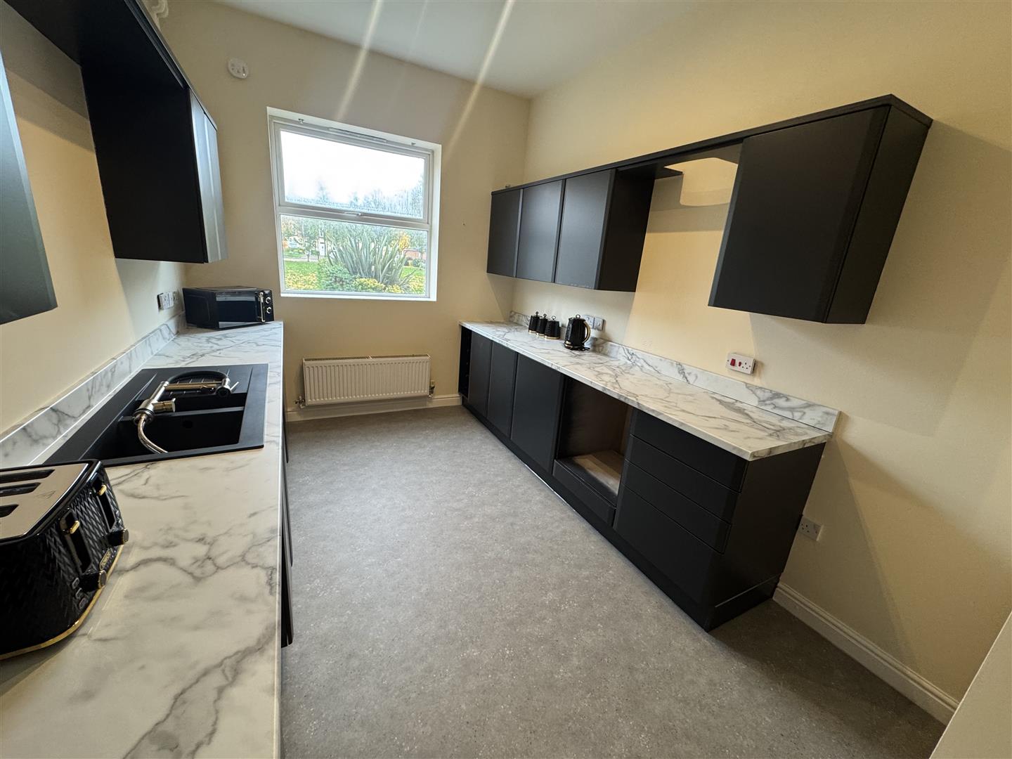 – Washing machine, tumble dryer, microwave, kettle, and toaster provided